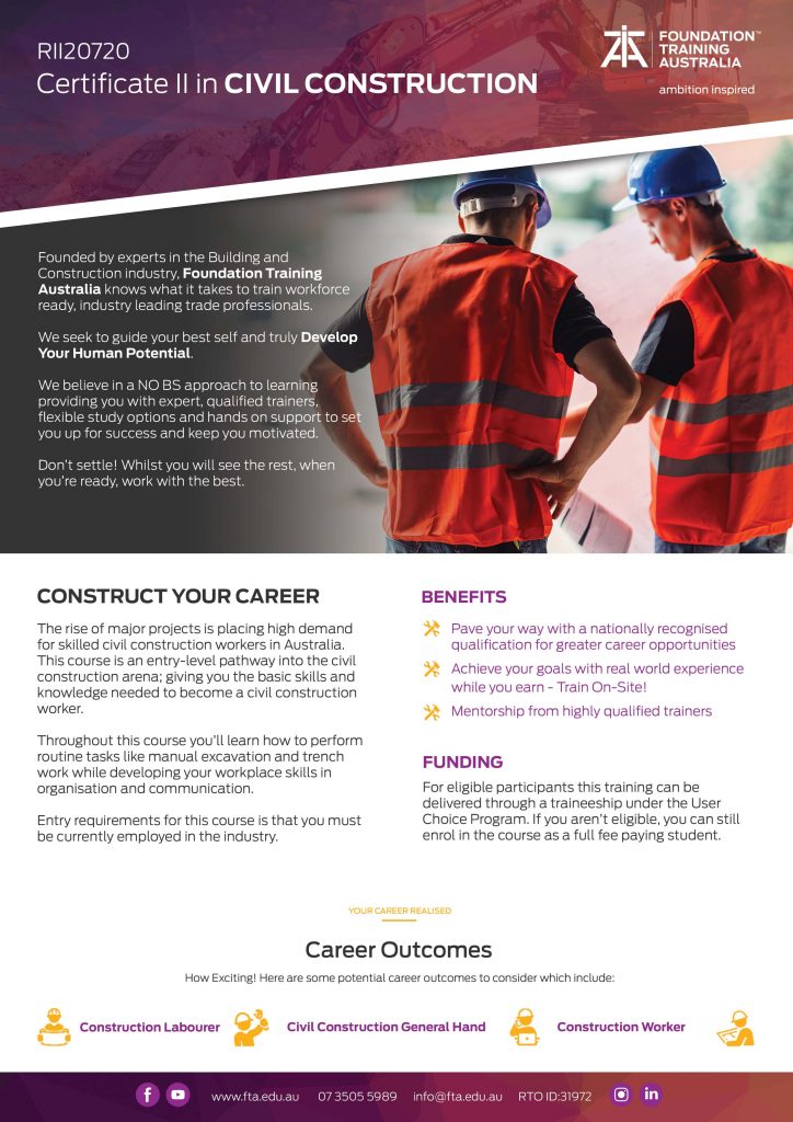 The rise of major projects is placing high demand for skilled civil construction workers in Australia. This RII20720 Certificate II in Civil Construction is an entry-level pathway into the civil construction arena; giving you the basic skills and knowledge needed to become a civil construction worker.