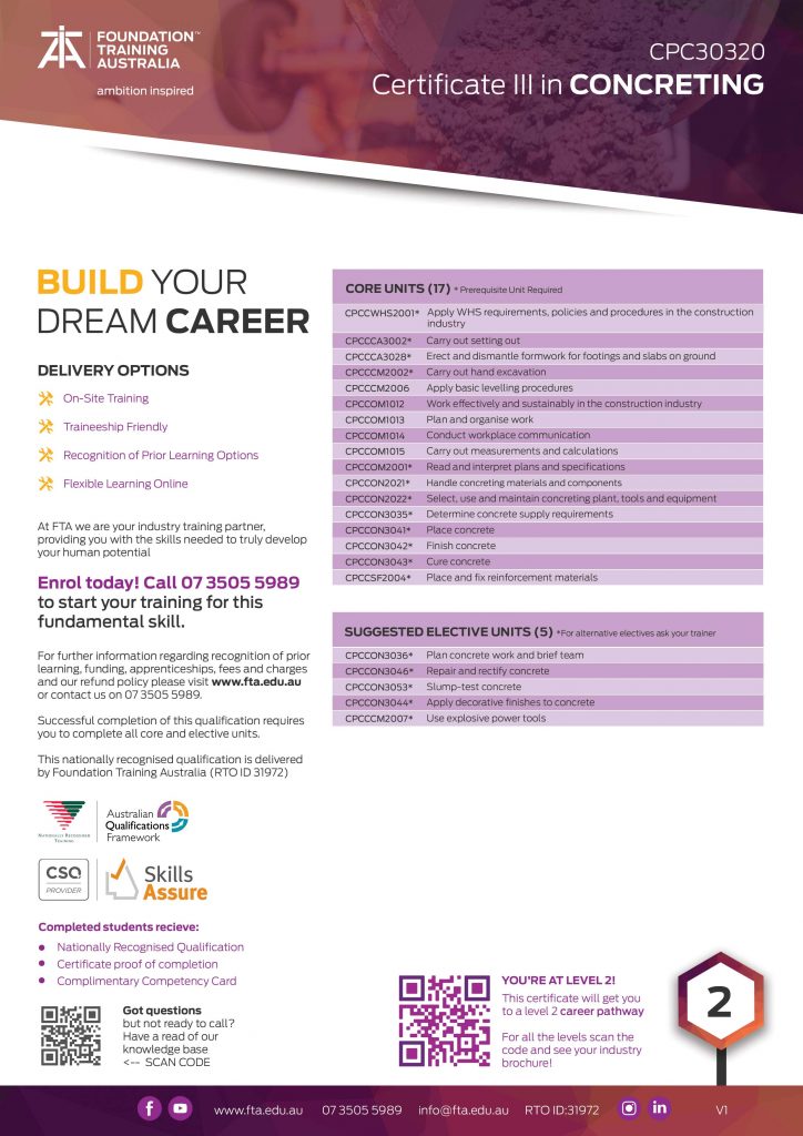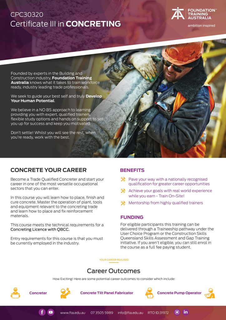 The CPC30320 Certificate III in Concreting can be completed as a traineeship and meets the technical requirements to obtain your QBCC Concreting License.