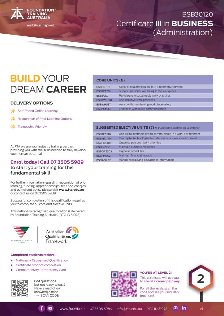 Build your career in Business Administration with the BSB30120 Certificate III in Business (Administration) qualification which will allow you to develop a strong set of professional skills that Employer’s value.