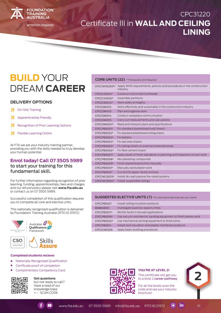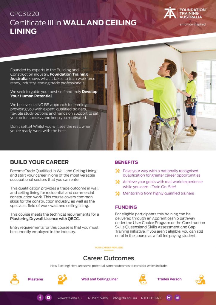 The CPC31220 Certificate III in Wall and Ceiling Lining can be completed as an Apprenticeship and meets the technical requirements to obtain your QBCC Plastering Drywall Licence.