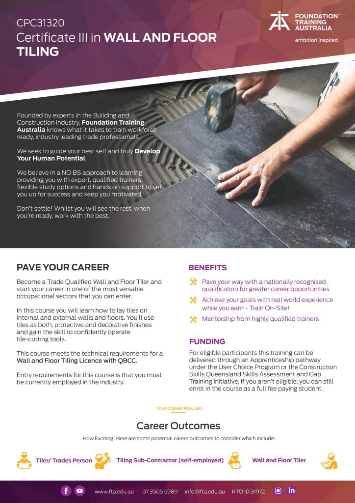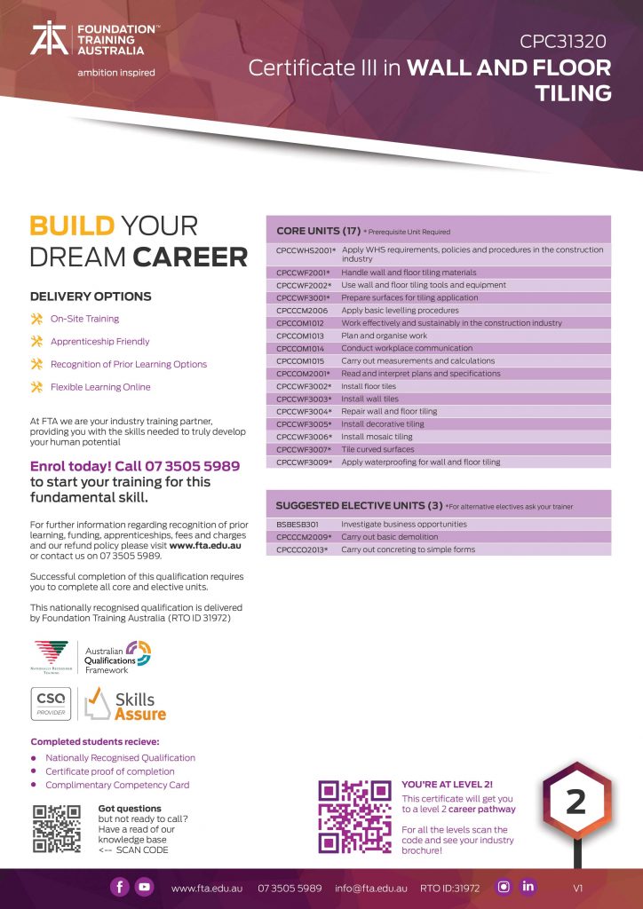 - Successful completion of either an apprenticeship in wall and floor tiling or the CPC31311 Certificate III in Wall and Floor Tiling.
