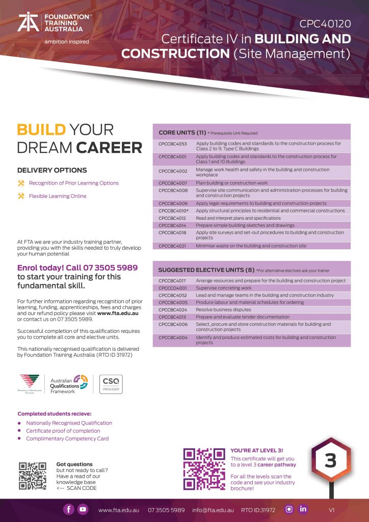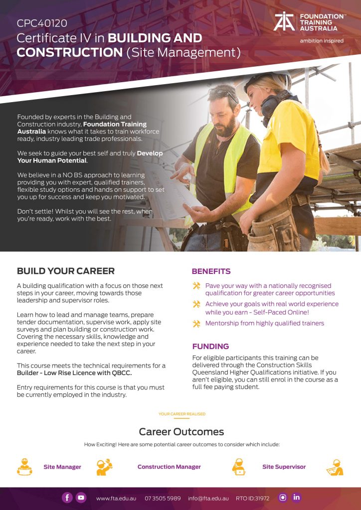 The CPC40120 Certificate IV in Building and Construction (Site Management) can be funded under the Construction Skills Queensland (CSQ) Higher Qualification Initiative* You may also be eligible for RPL allowing you to fast track your qualification.