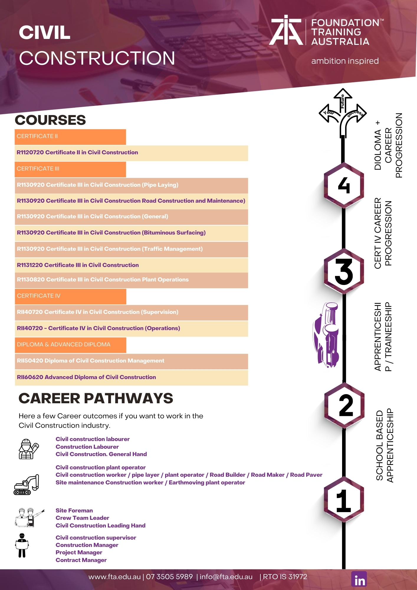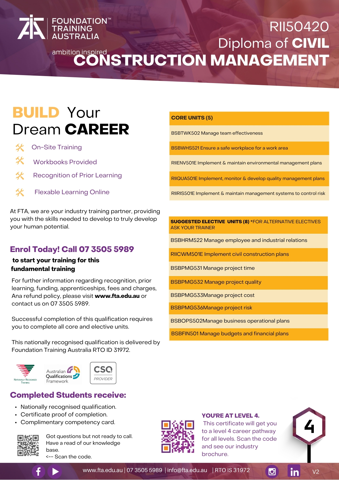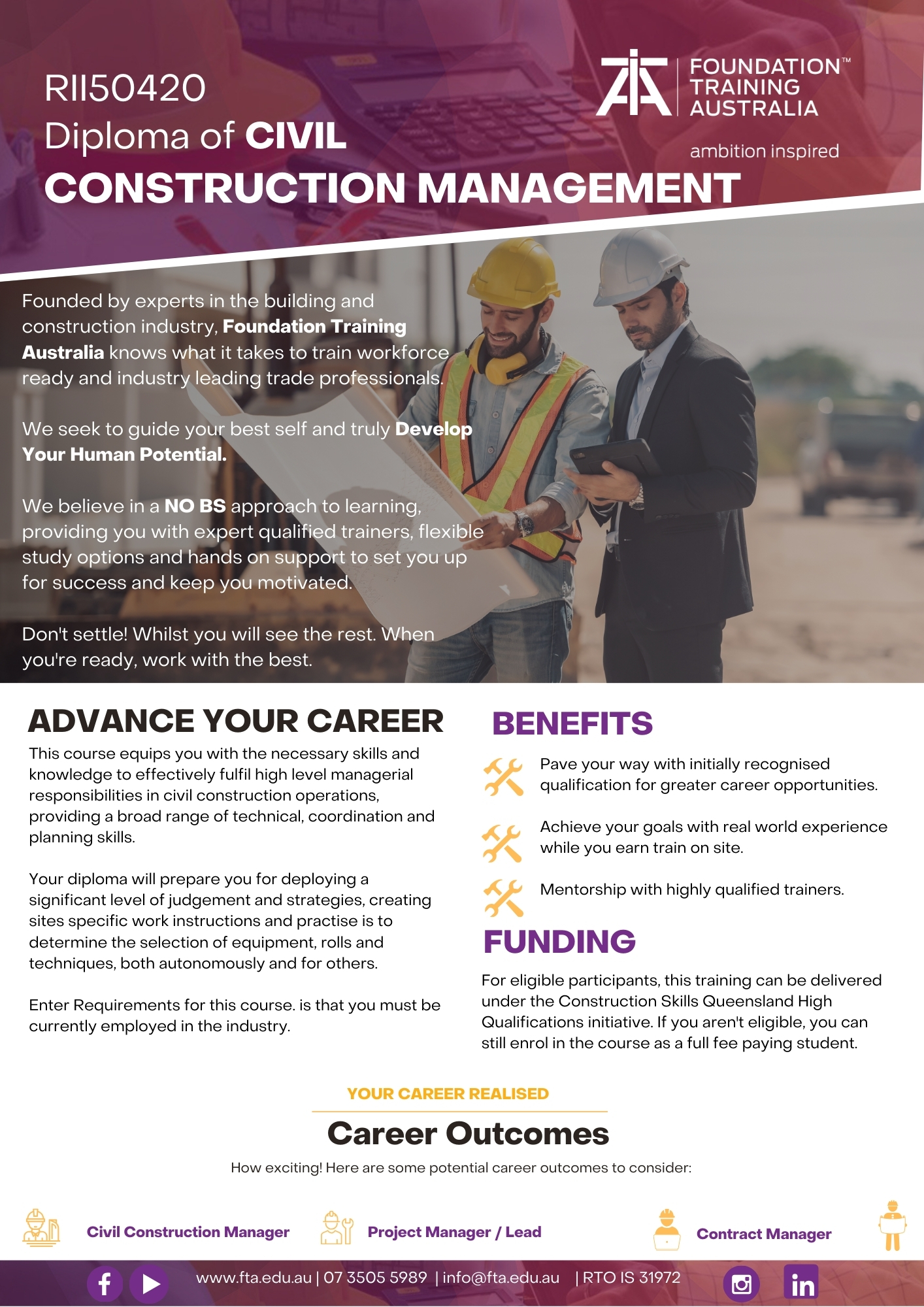 The RII50420 Diploma of Civil Construction Management can be funded under the Construction Skills Queensland (CSQ) Higher Qualification Initiative* You may also be eligible for RPL allowing you to fast track your qualification.