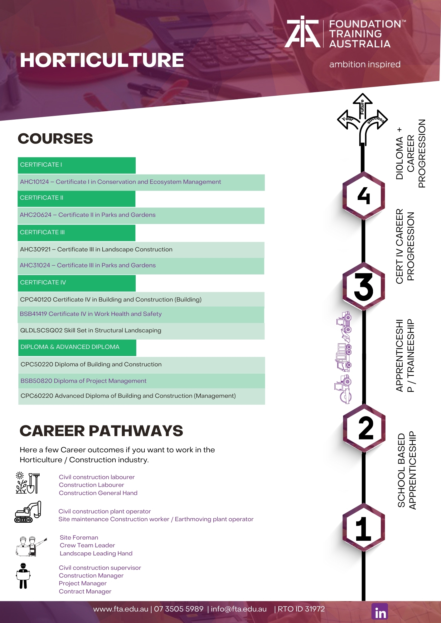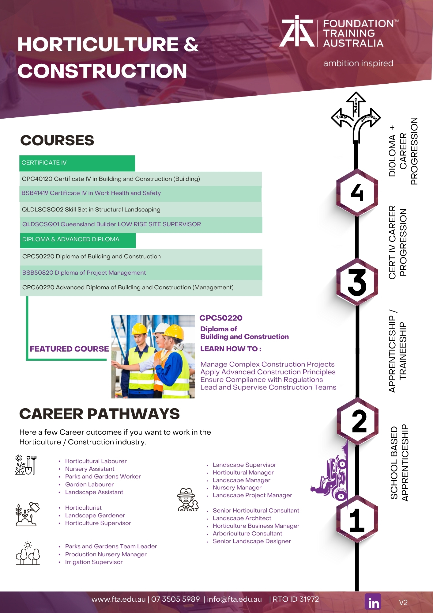 The Queensland Structural Landscaper course equips learners with the skills to oversee work health and safety, estimate project costs, select and manage construction materials, and ensure compliance with legal requirements. It also covers effective communication and administrative processes to ensure smooth project execution from start to finish